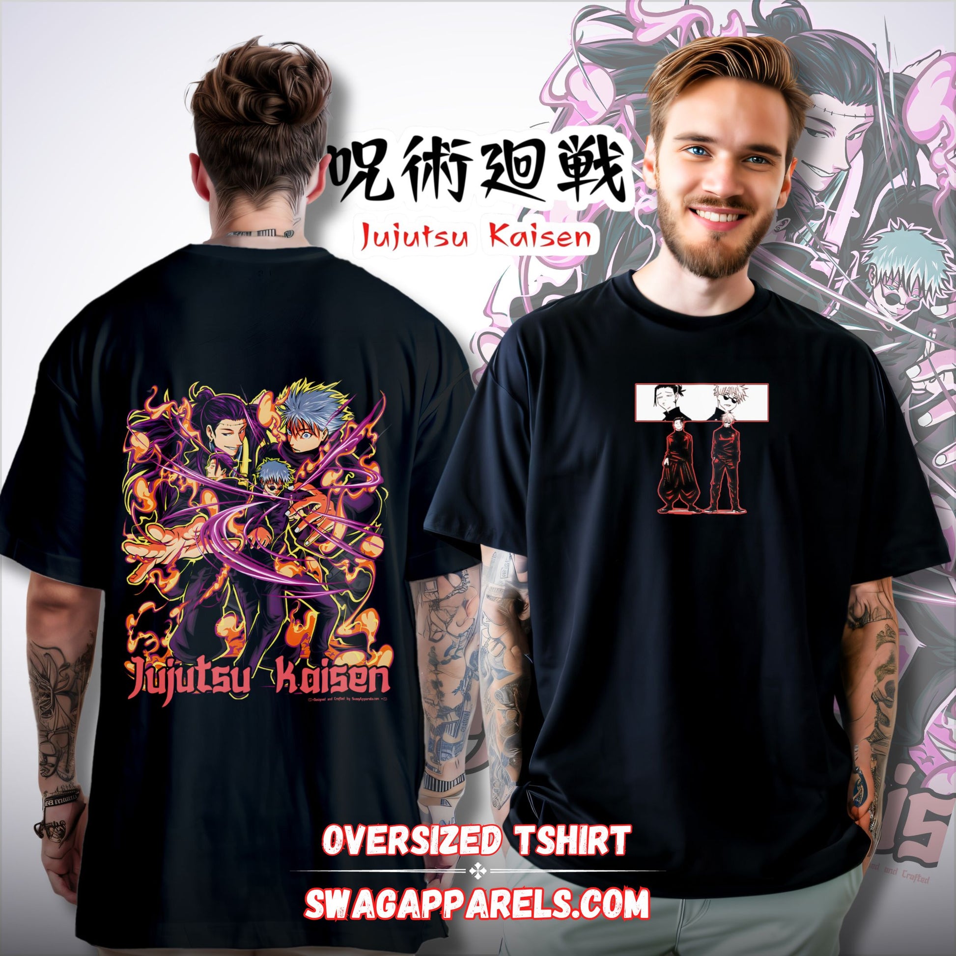 - Anime-Inspired Design: Celebrate the dynamic duo of Gojo and Geto with this oversized tshirt. A tribute to the iconic Jujutsu Kaisen characters, this tee is a blend of style and fandom.